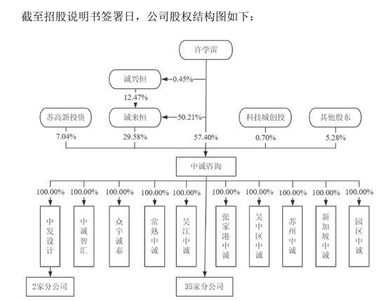 2022年12月23日,许学雷将持有的中诚咨询357.14万股以4999.99万元转让给苏州苏高新产业投资有限公司(简称“苏高新投资”),转让完成后,苏高新投资持有中诚咨询7.14%股份,为第三大股东。天眼查显示,苏高新投资是苏高新集团的全资子公司。