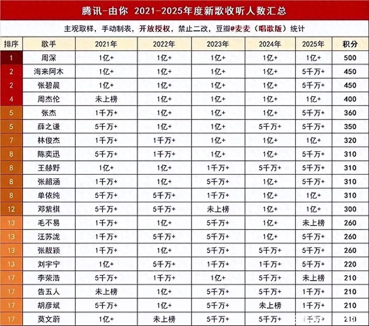 需特别说明的是,本榜单统计对象严格限定为“当年首发新歌”的收听人次,而非歌手全量作品累计播放量。